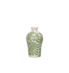 Chic green & cream ceramic vase with vine design. Both functional & fun, this beautiful vase can be styled by itself in a bookshelf or hold dainty flowers on a side table!